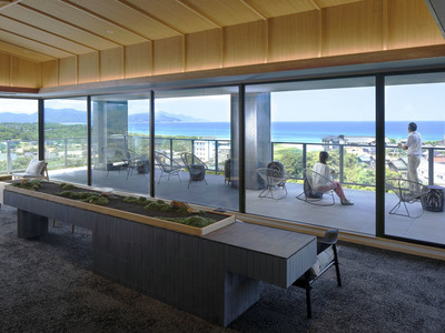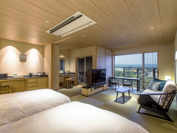 An exclusive adults-only retreat with just 18 rooms, perched on the hills of Yuhigaura Onsen. With only three rooms per floor, every guest room features a private terrace and a hot spring bath with a scenic view. On the top floor, guests can enjoy a graceful moment watching the ocean and the sunset from the dedicated "Lounge Terrace AO."