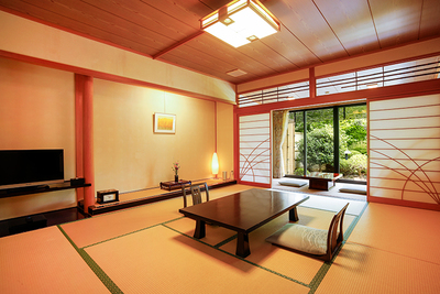 Located on the 1st floor of the West Annex, this spacious room features a 12 or 12.5-tatami Japanese room, a veranda (hiro-en), and a private open-air bath with natural hot spring water.