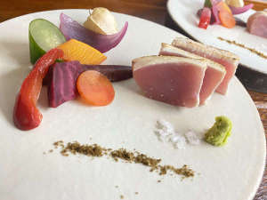 Dinner: A creative Kaiseki course featuring stone-grilled Tajima beef "ichibo" as the main dish, accompanied by seasonal seafood and vegetables.